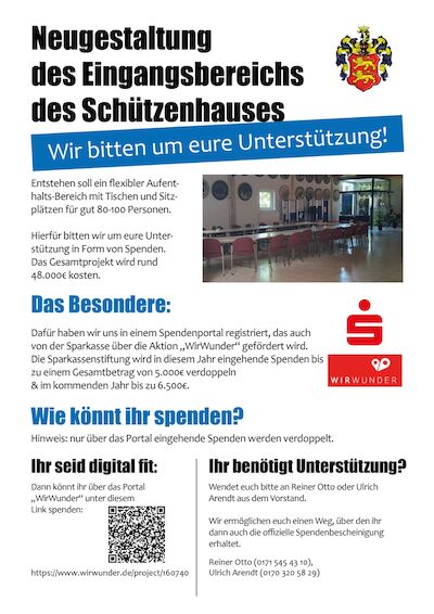 Aufgrund der Kostensituation wurde seinerzeit die Möblierung dieses neugeschaffenen Bereiches zurückgestellt und mit vorhandenen Tischen und Stühlen provisorisch ausgestattet. Nun möchte die Schützengesellschaft im Hinblick auf das Jubiläum "725 Jahre Schützengesellschaft" im Jahr 2027 dieses Provisorium beenden und die Räume mit entsprechendem Mobiliar ausstatten. Entstehen soll ein flexibler Aufenthalts-Bereich mit Tischen und Sitzplätzen für gut 80-100 Personen. Hierfür bitten wir um eure Unterstützung in Form von Spenden. Das Gesamtprojekt wird gut 48.000€ kosten.