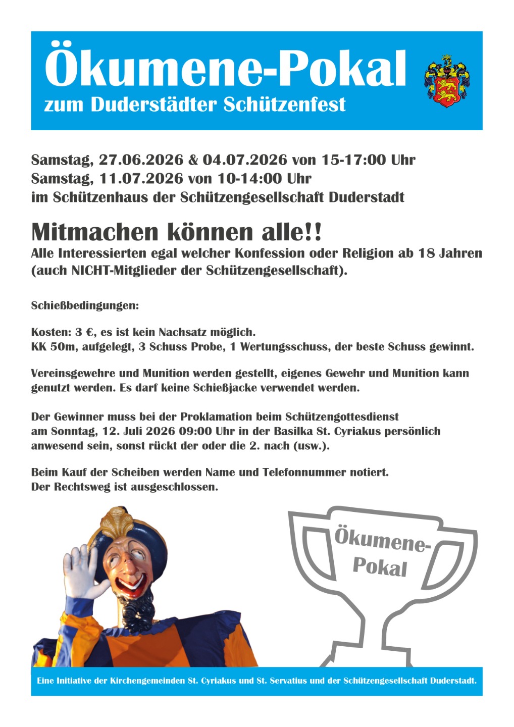Im Jahr 2026 findet das Schießen auf den Ökumene-Pokal am Samstag, 27.06.2026 und 04.07.2026 von 15-17 Uhr, sowie am Schützenfestsamstag, 11.07.2026 von 10-14 Uhr statt.